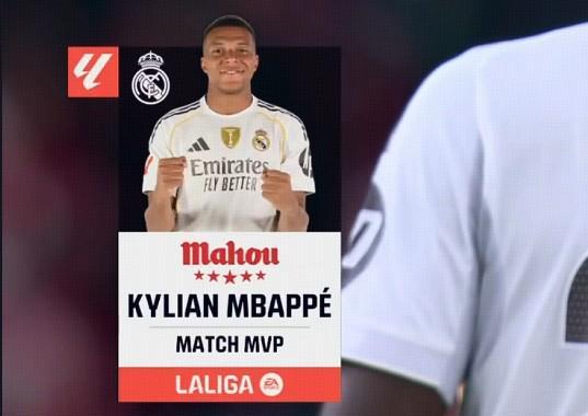 官方消息,姆巴佩当选毕尔巴鄂竞技对阵皇家马德里一役全场最佳。